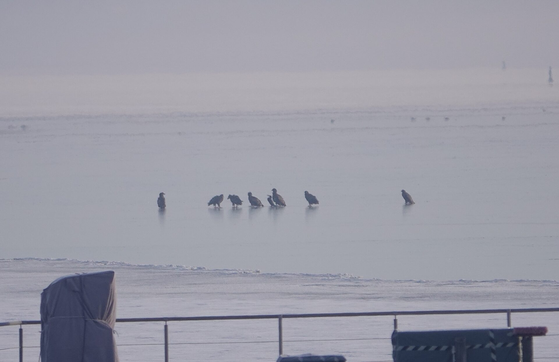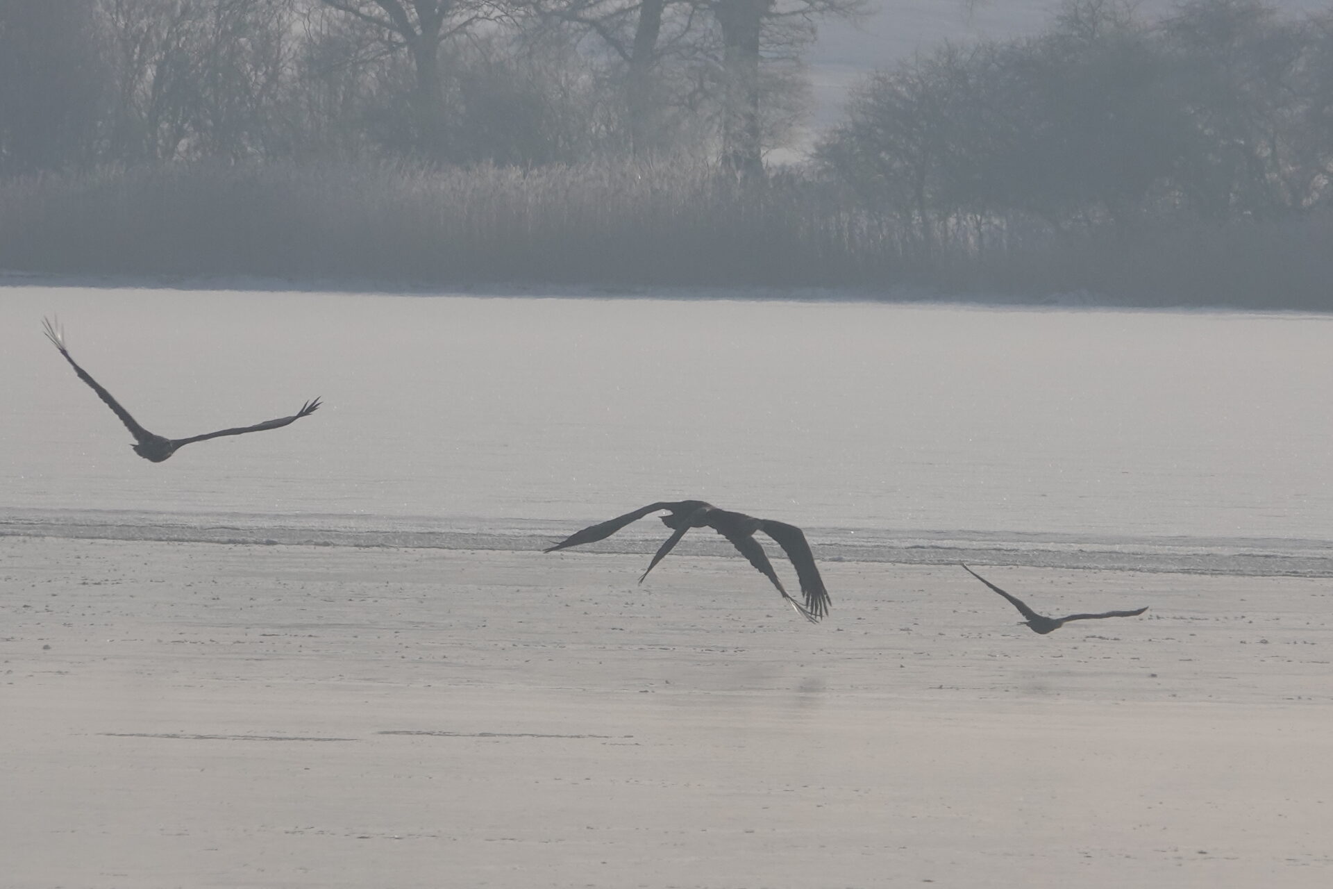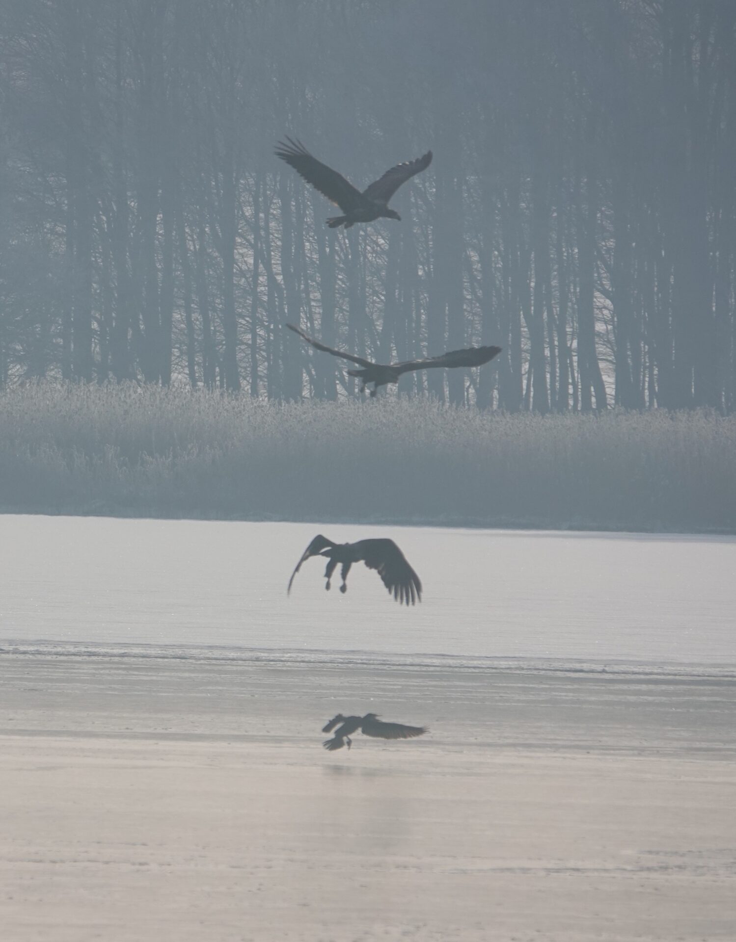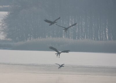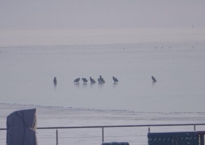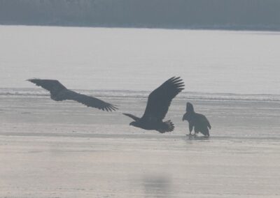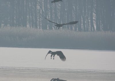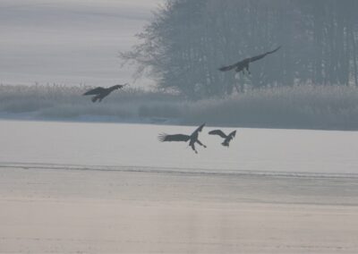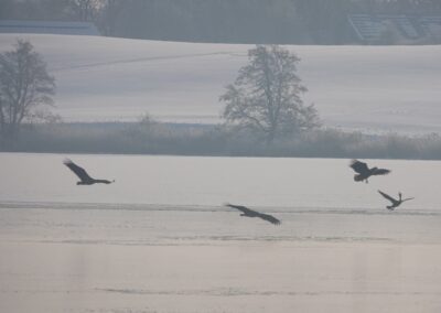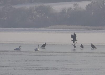 Sieben Seeadler jagten am 19.2.2026 einen Kormoran auf dem Eis der Schlei. Glück gehabt: Der Kormoran entkam schließlich nach etwa zwei Stunden.