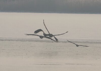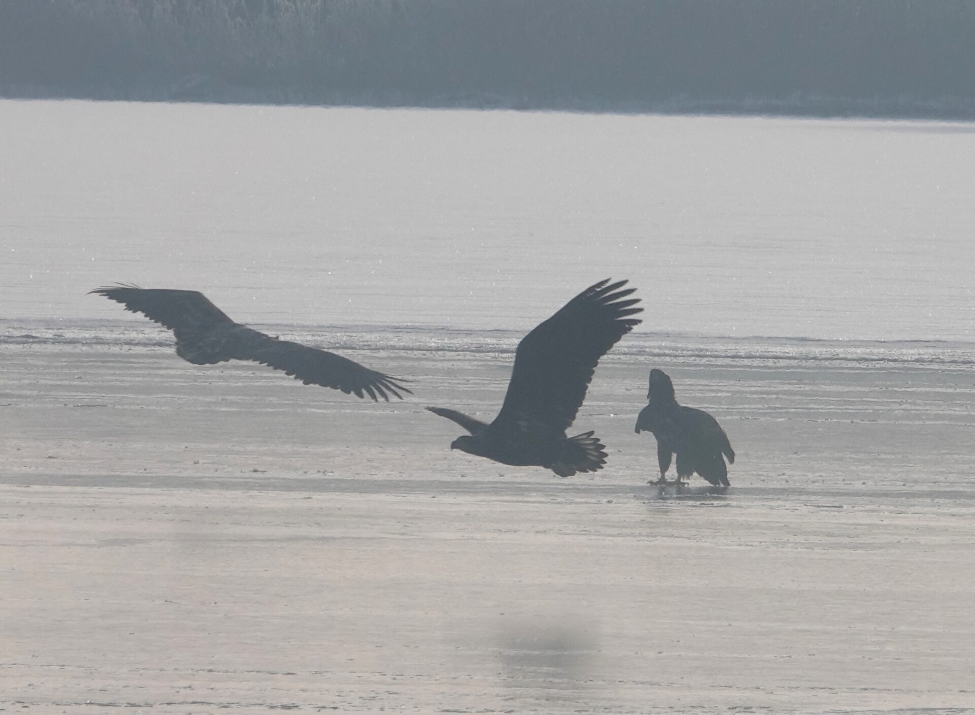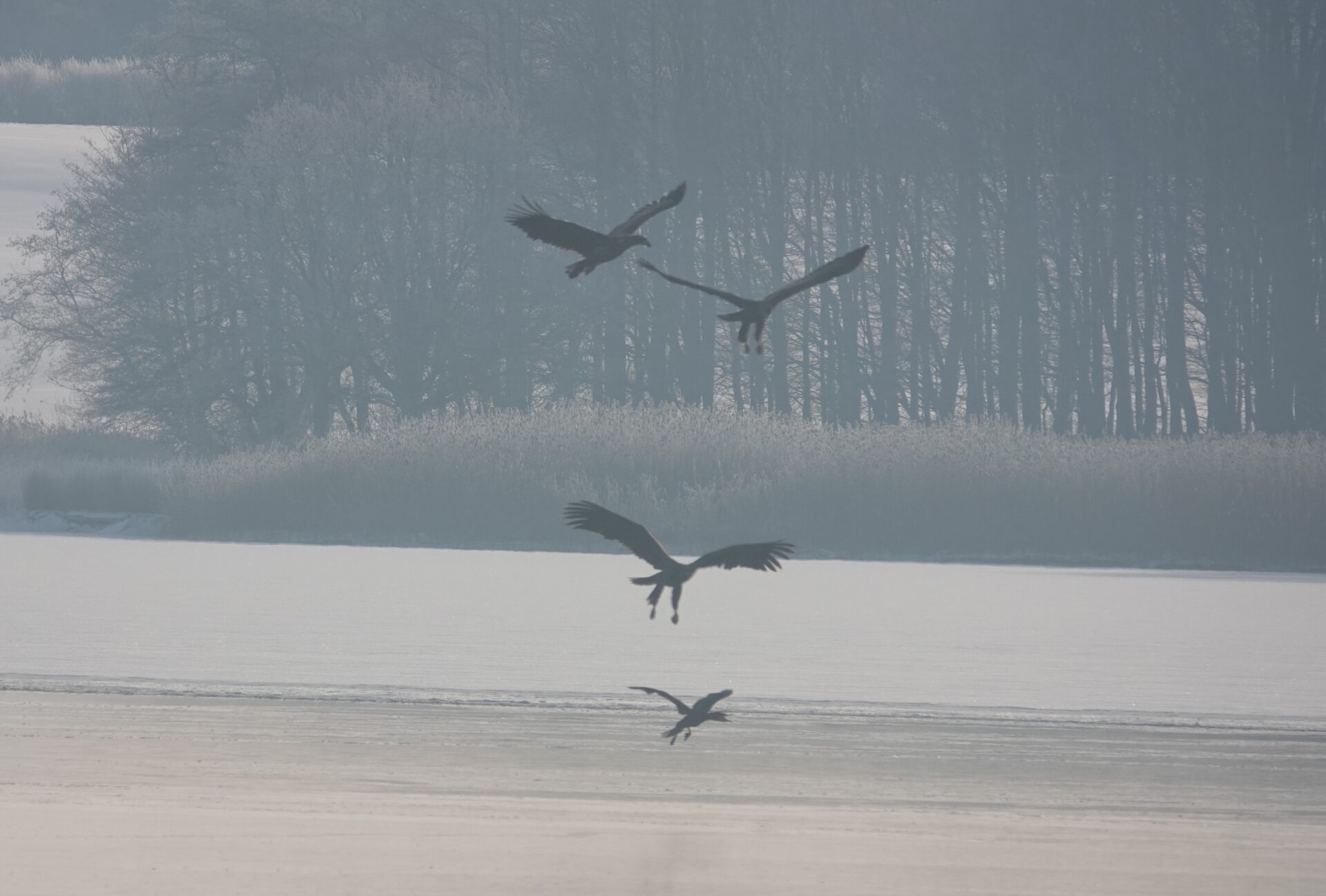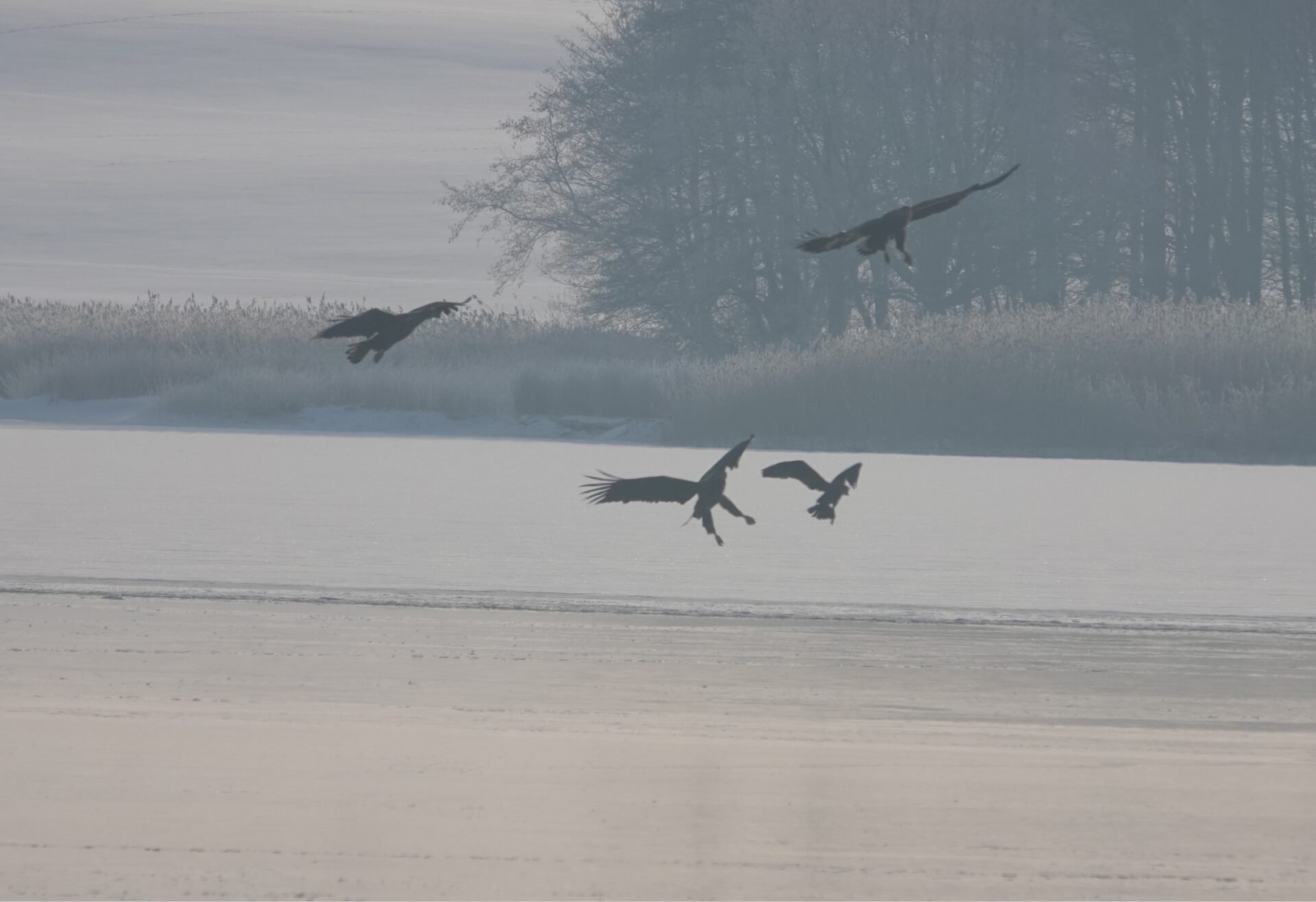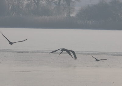 Sieben Seeadler jagten am 19.2.2026 einen Kormoran auf dem Eis der Schlei. Glück gehabt: Der Kormoran entkam schließlich nach etwa zwei Stunden.